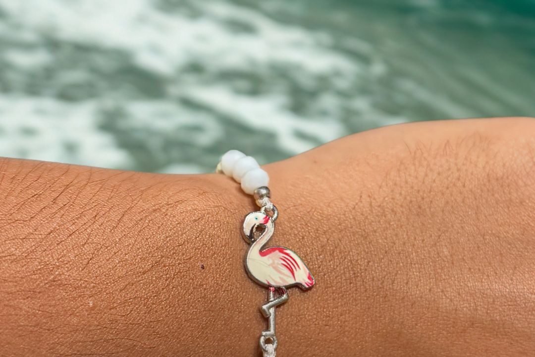 سوار خرز أبيض بتعليقة فلامنجو أنيقة – إكسسوار صيفي للشاطئ