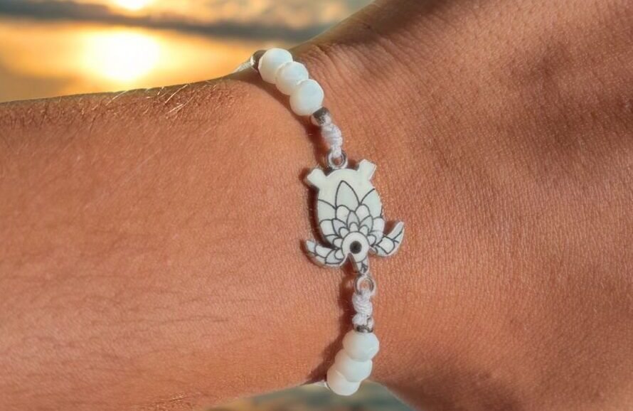 يتميز السوار بـخرزات بيضاء ناصعة ذات لمعة لؤلؤية، تضفي عليه مظهرًا ناعمًا ومشرقًا يذكر بالرمال البيضاء أو أصداف البحر. القطعة المركزية هي تعليقة سلحفاة بحرية فضية اللون، مطلية بـالمينا الأبيض والأسود بنمط زهري/هندسي دقيق وجذاب. السلحفاة هي رمز لطول العمر والحماية والسلام، وتصميمها المحايد باللونين الأبيض والأسود يجعل السوار متعدد الاستخدامات.