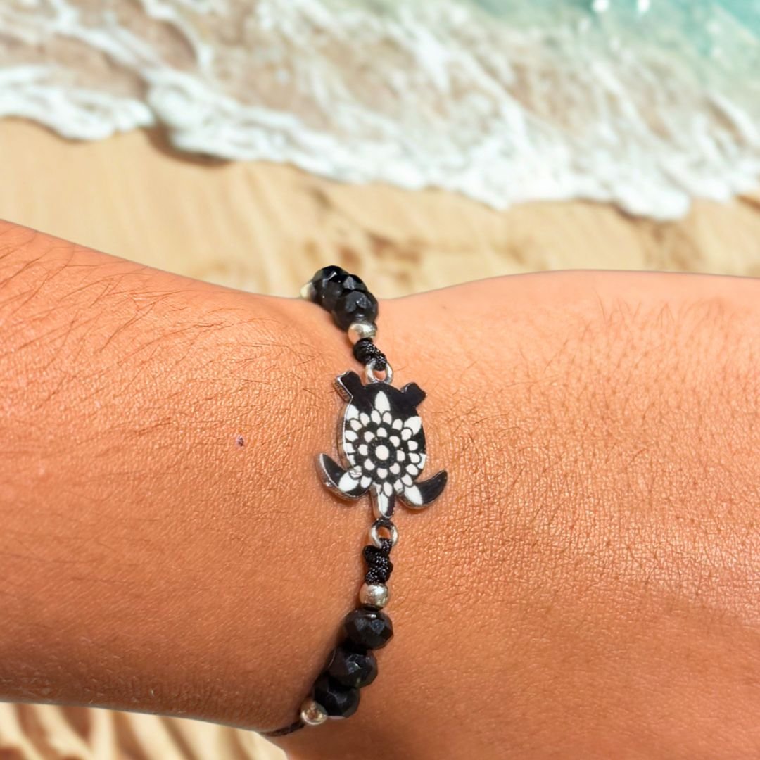 يتميز السوار بـخرزات سوداء داكنة (قد تكون من حجر العقيق الأسود أو الزجاج) تضفي عليه مظهرًا فخمًا وجذابًا. يتوسط التصميم تعليقة سلحفاة بحرية فضية اللون بطلاء مينا باللونين الأبيض والأسود بنمط زهرة (ماندالا) جميل ومفصل. السلحفاة هي رمز للحكمة وطول العمر والاستقرار، بينما يضيف اللون الأسود لمسة عصرية وكاجوال.