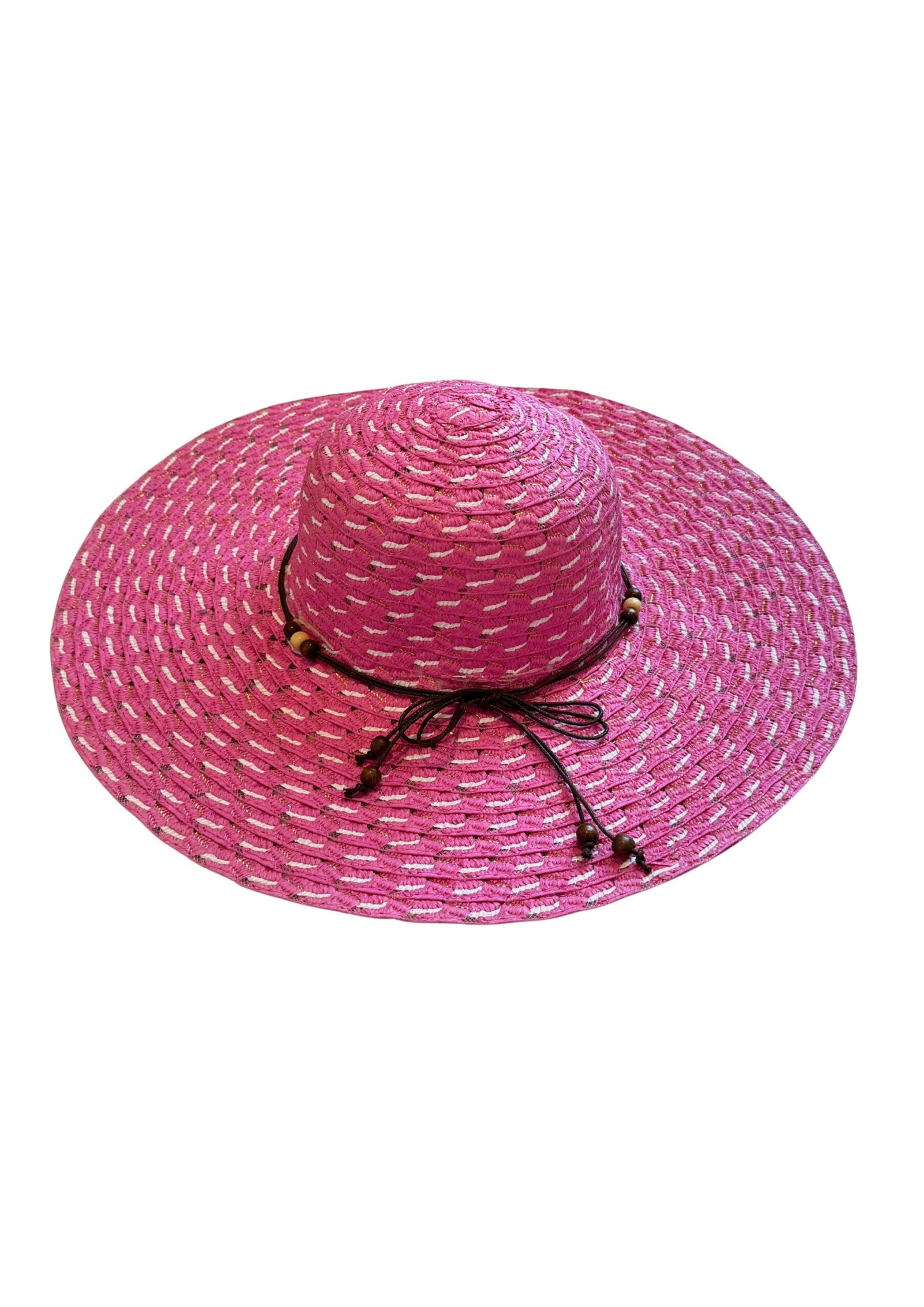 القبعة مصنوعة من قش منسوج خفيف الوزن بلون فوشيا ساطع يتخلله خيوط بيضاء أو فاتحة، مما يمنحها مظهرًا عصريًا ومميزًا. يوفر حزامها العريض جدًا حماية مظللة كاملة للوجه والرقبة والأكتاف، مما يجعلها مثالية لقضاء ساعات طويلة تحت الشمس.