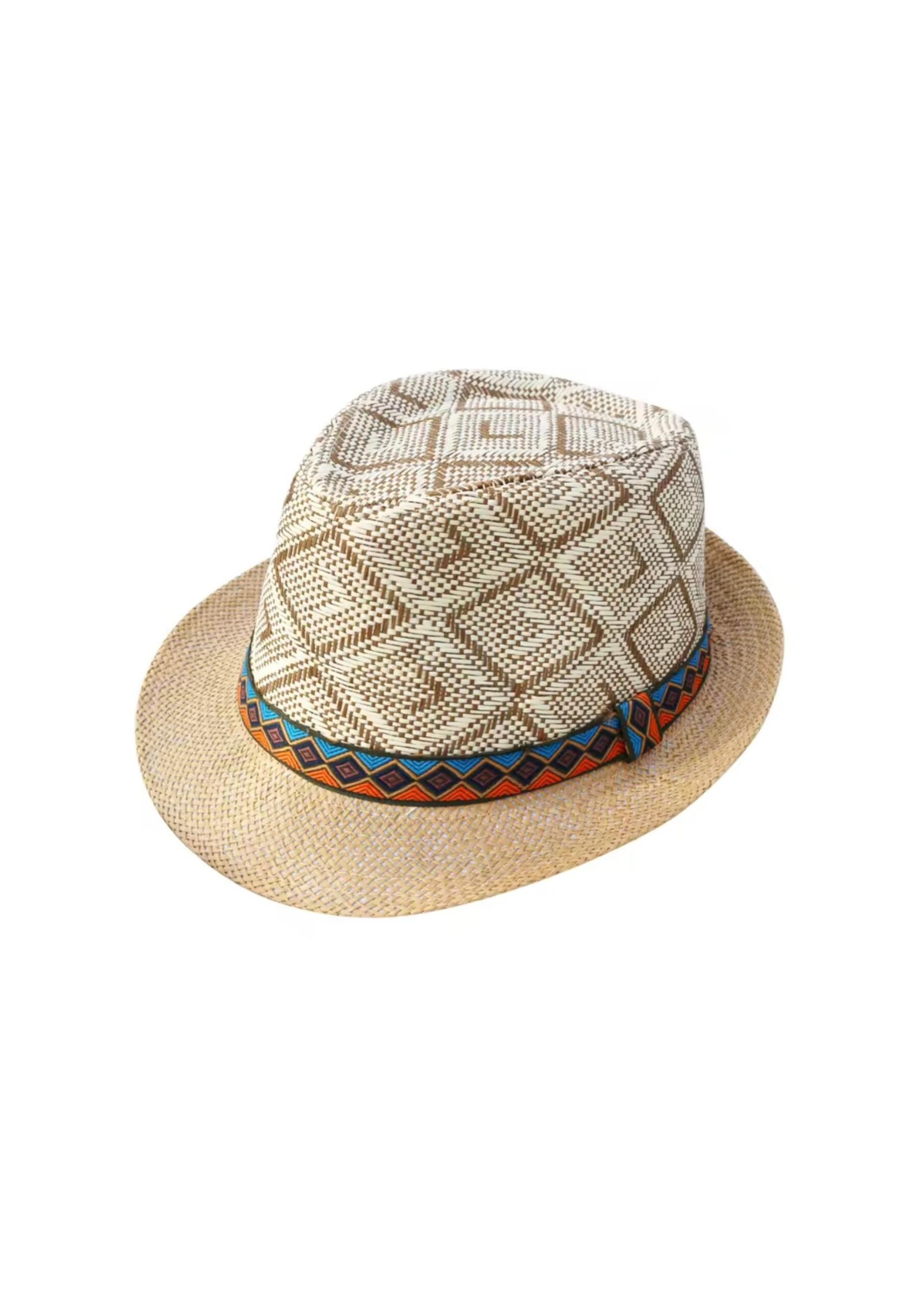 قبعة فيدورا صيفية من القش بنمط بوهيمي – تصميم هندسي وعصابة رأس ملونة