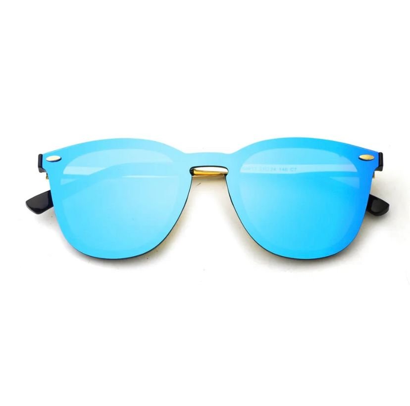 تتميز النظارة بعدسات عاكسة (Mirror Lenses) باللون الأزرق السماوي/الفيروزي الساحر، والتي توفر حماية ممتازة للعينين من الوهج وأشعة الشمس الضارة (عادة ما تكون UV400). تمنحك هذه العدسات مظهراً ملفتاً ومميزاً في أي تجمع صيفي أو رحلة شاطئ.